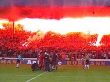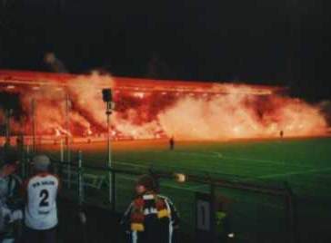 Offenbach is playing in the third league, but we have more fans than everybody else in Germany (well, this isn't true at all, but we are a lot compared with other teams in this league). At a normal game there are about 8000-10000 fans, at the end of the season there are sometimes about 20000. Then we call it "The hut is burning, or the mountain burns"! If you are in Offenbach we will go there.