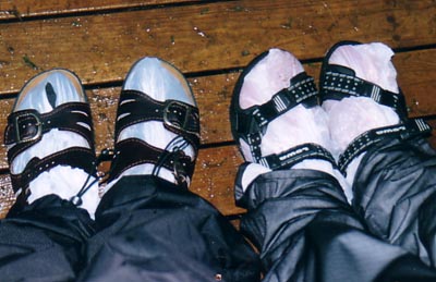After a while we got warm and we were all happy (well, I can only tell you my feelings). At about 1 am we decided to go on the glacier which was next to the camping ground. Perhaps you think now: "What, a glacier next to a camping ground?" Well, that is Iceland. To go on a glacier you should be well prepared. Well, I am not talking about crampons, you don't need them at the bottom of this glacier, this one is really flat. It was wet, the ice was melting (it was summer) so we prepared our shoes.