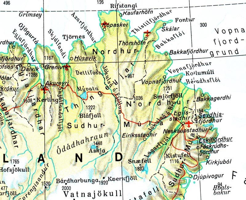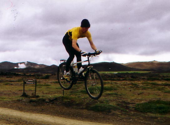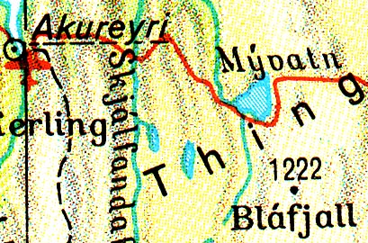 Myvatn, that is the spot where you should go when you are in Iceland. There is everything (well, not everything, but a lot of stuff which is really interesting). Myvatn is in the north - eastern part of Iceland (see the map, the red line was our track in the last days, at the right bottom you can see Djupivogur). It is about 100 km's away from Akureyri (the capital of the north), but that is not the interesting thing of Myvatn. Myvatn is a geotechnical active area. There is also a lot over geothermal stuff going on. Myvatn is a lake, but the hole area around is also called Myvatn. The next days we stayed there and went on volcanoes, into hot water caves, walked on solidified but still warm lava (from the last eruption which was only a few years ago), watched smoking brimstone fields and were delighted of bubbling mud holes.
