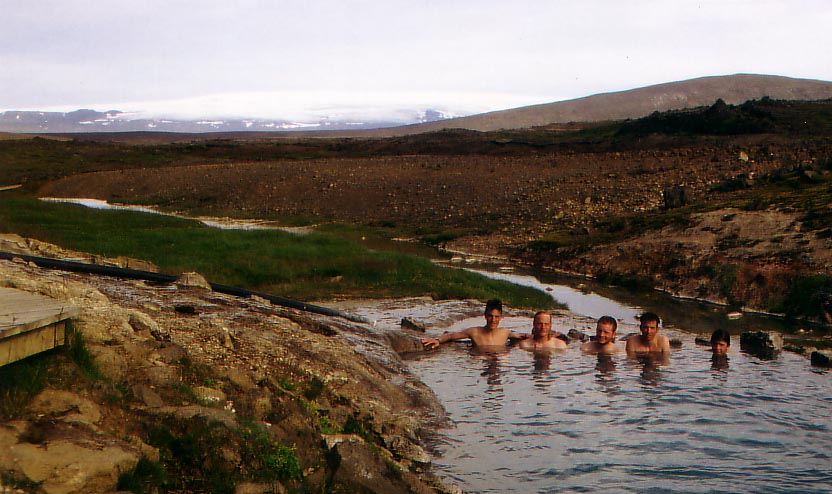 After a few hours we reached Herveravellir. This is a hot spot right in the middle of the desert. We were lucky that we stayed there over night. During the afternoon there were heaps of people around, it was really busy. We lay in the hot spot for ages and enjoyed it. The special thing was a pipe with hot water. You could put it in or out, so you could control the temperature of the water (it was damn hot).