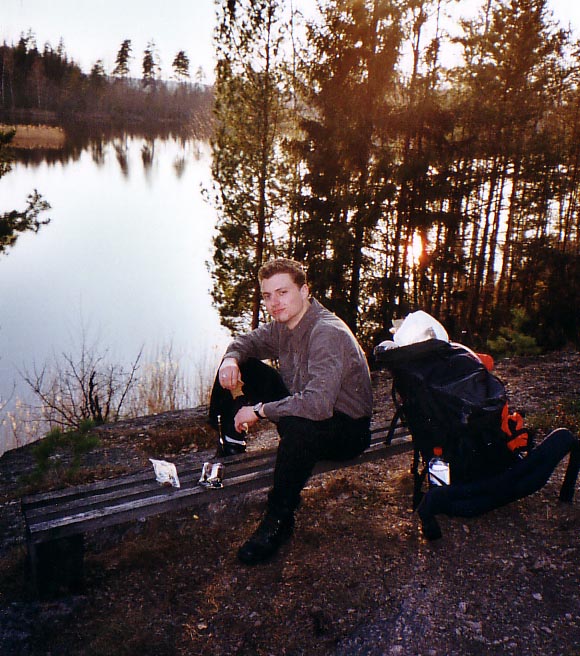 After about 6 hours of hiking we looked out for a shelter (on the map there where some symbols for shelters). We weren't sure where the next one would be and so we decided to have our camp outside tonight. Well, this is normally not a problem, but it was eastern and we hadn't a tent. We were damn lucky that the weather was so nice, we had about 20 degrees, no rain and the sun was shining. Our camp side was next to an lake.