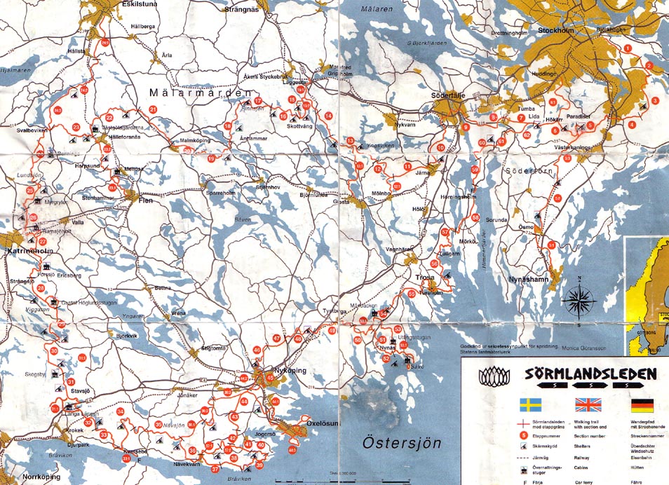 Sörmlandsleden is in the south west of Stockholm. It is a quite area calm place with awesome nature. The whole three days we met only about 5 people and passed one small (really small) town. To get there we had to catch the train. It took about 1 hour and it wasn't too expansive. We jumped out of the train in Katrineholm (on the left middle side of the map). From there our track started. All over you can walk for ages, we picked out the part between Katrineholm and Djurpark (south of Katrineholm, north of Norrköping). All the red dots with numbers are stages of the track, in between there are shelters and sometimes huts (the shelters are for free, you have to book the huts).