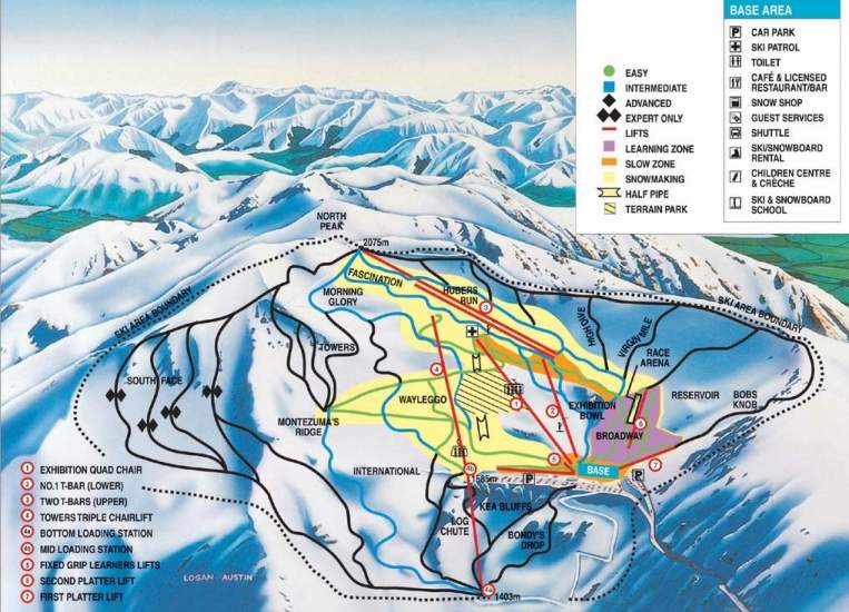 Das Skigebiet sieht zwar rießig aus, ist es aber nicht wirklich. Vor allem wenn es nicht genügend geschneit hat und die ganzen Interessanten (schwarzen) Pisten gesperrt sind. Ich werde dann wohl nochmal demnächst hinfahren müssen. Oben links sieht man die Canterbury Planes, das ist schon sagenhaft. Da fährst du Ski und hast Aussicht auf eine rießige Tiefebene und normaler Weise auf das Meer (wenn es nicht so bewölkt ist wie es bei mir war).
