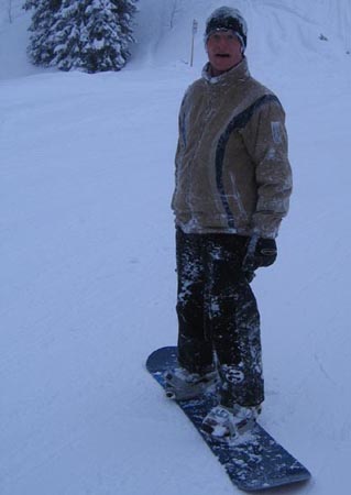 after a long off slope run riding through the village