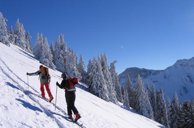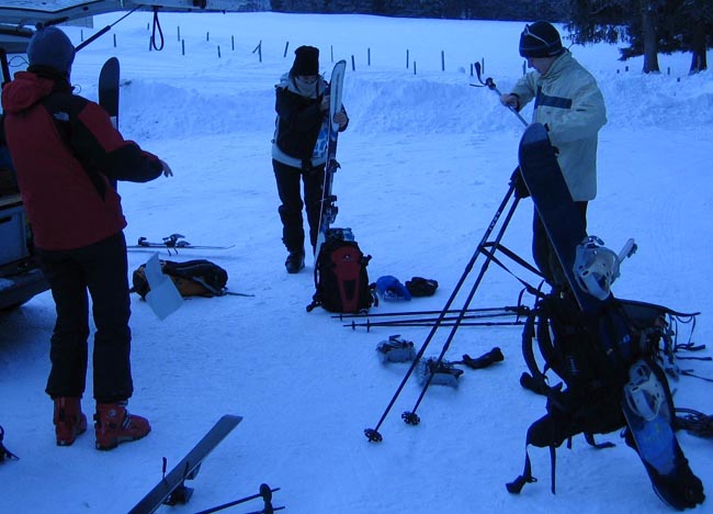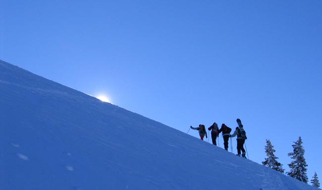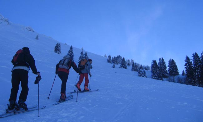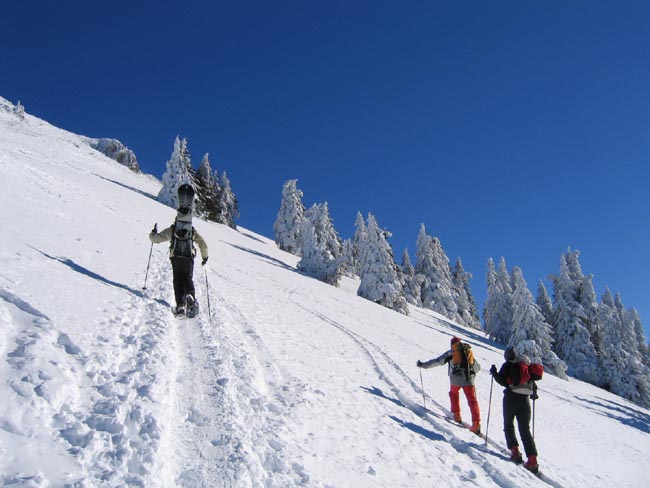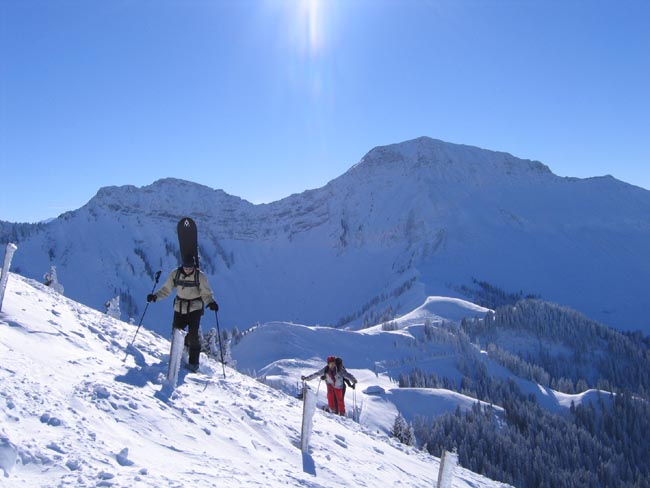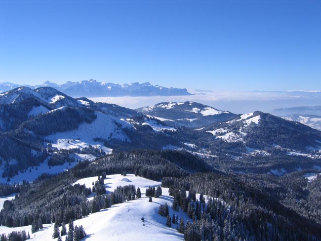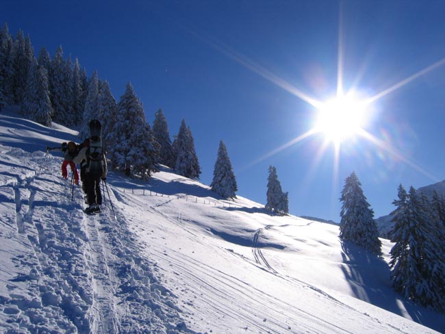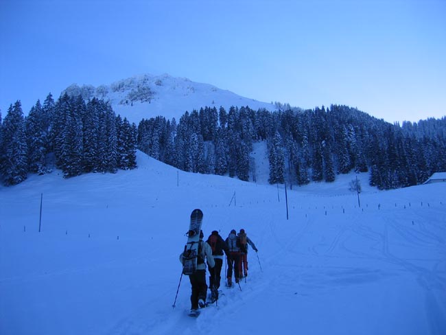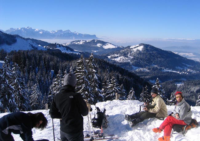 went on a ski tour with guys from uni and the sport club, we had a good time and awesome weather. our destination was teysachaux, a mountain next to lac leman, 15 km away from vevey. we started at about 1200m and hiked up with skis and skins or snow shoes. the guide (thank you very much Jean-Jacques) and the group were funny, the sun was amazing. the snow was okay but due to the fact that there was a lot of wind during the last days the fresh snow was gone or frozen, difficult to ride.