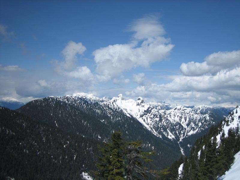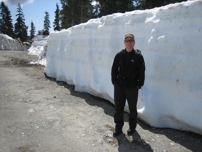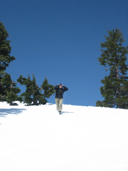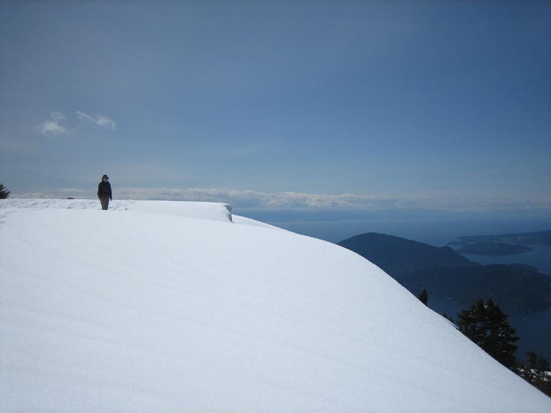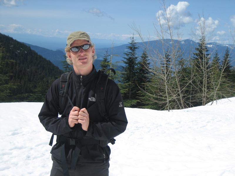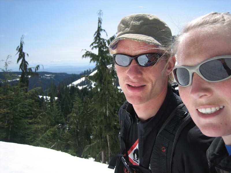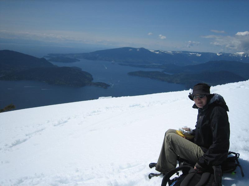 kerstin hiking up a ski slope where we skied in the winter, the ubc in the back