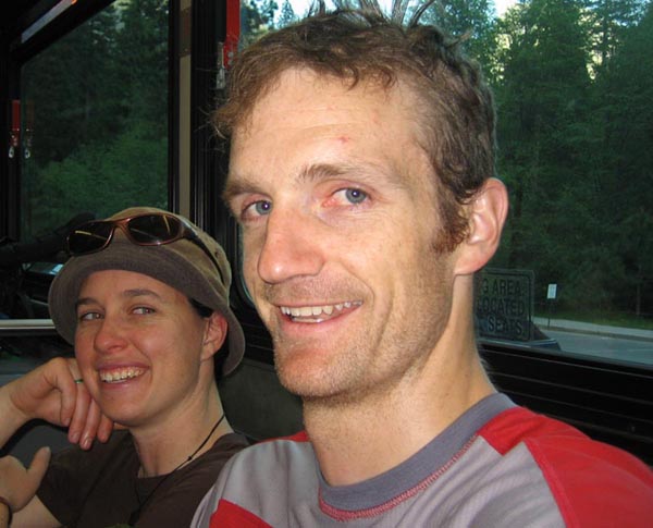 Terri and Paul, happy to be back in the valley in the bus on the way back to our campground!