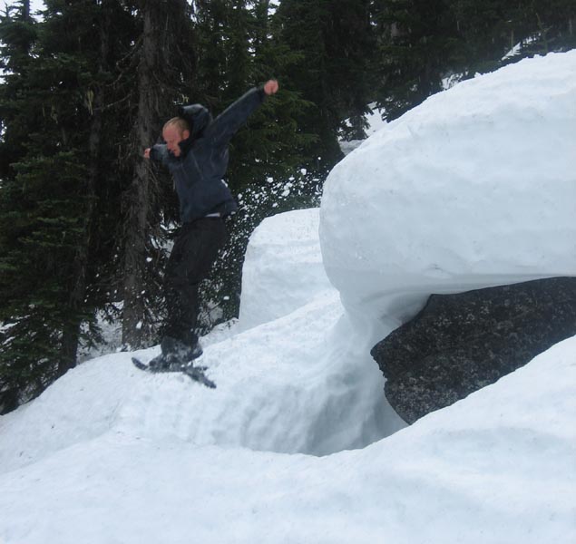 On our way back: Seppel jumping from a rock - with snowshoes!
