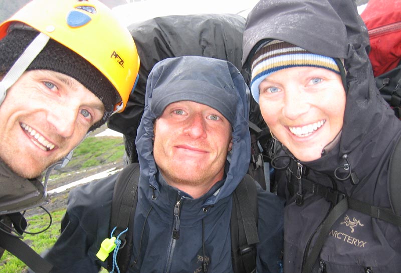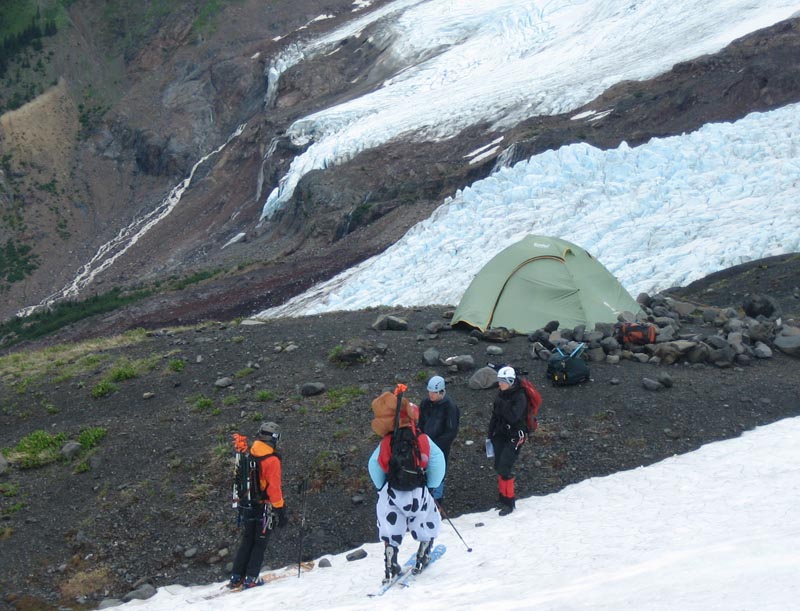 Two skiers with funny outfits (rain cloth) came down: They didn't make it to the summit due to the weather conditions and a huge fallen ice pack on the trail.