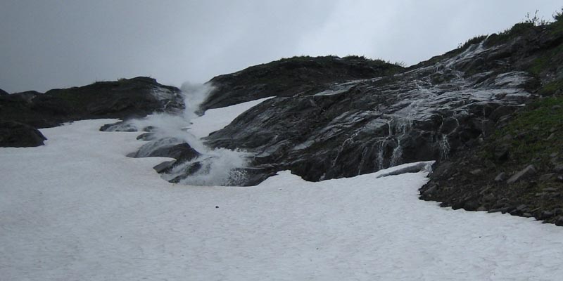 Melting water is coming down everywhere - we had to find a way around or crossing it via snow bridges!