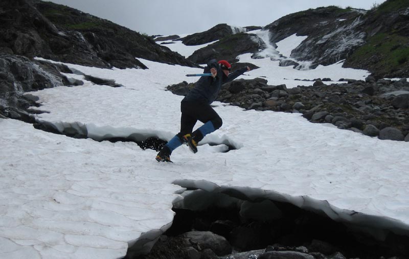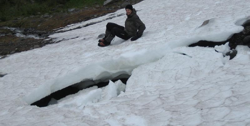 Sebastian tried to cross the leftover snow bridge, the one Paul cracked. He made it, even 3 times (he had to go back to give Paul the camera :)