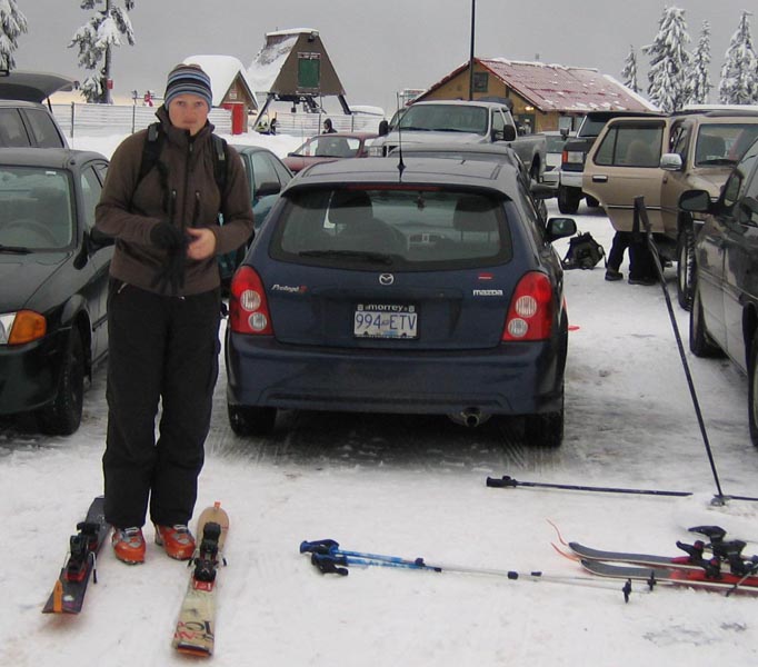Kerstin with her new ski gear and our new car in the back: Mazda Protege 5.