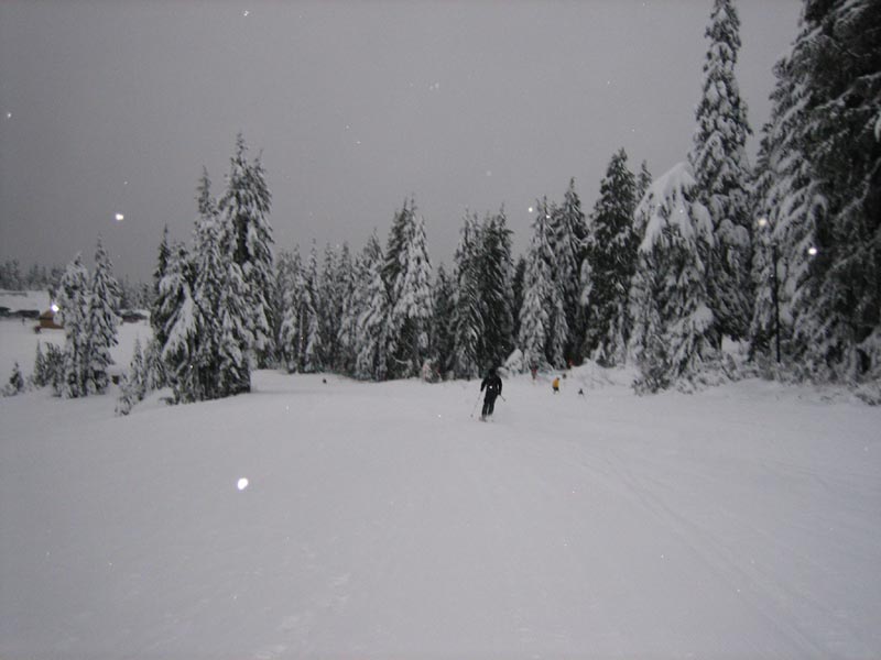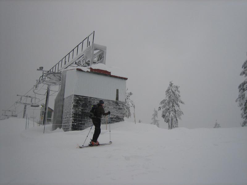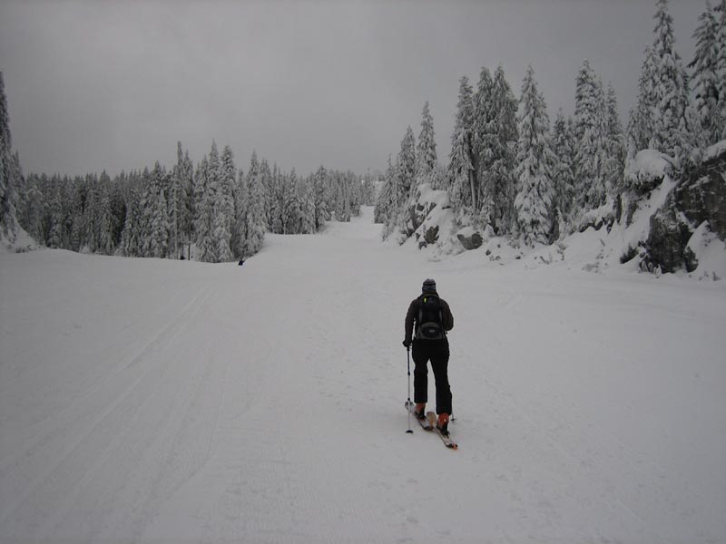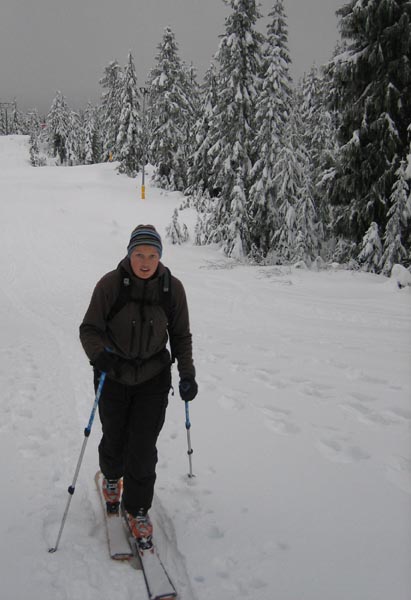 Well, it isn't our backyard but it isn't far away: The North Shore Mountains. We had a late start at 2pm. The drive to the parking lot at 1000m altitude took about 15 minutes. The downhill area is not open yet so we could skin up the groomed runs and ski down.