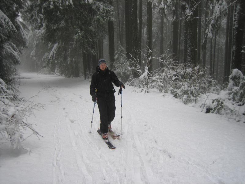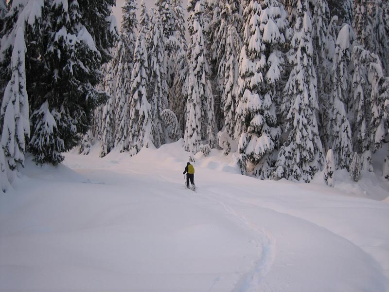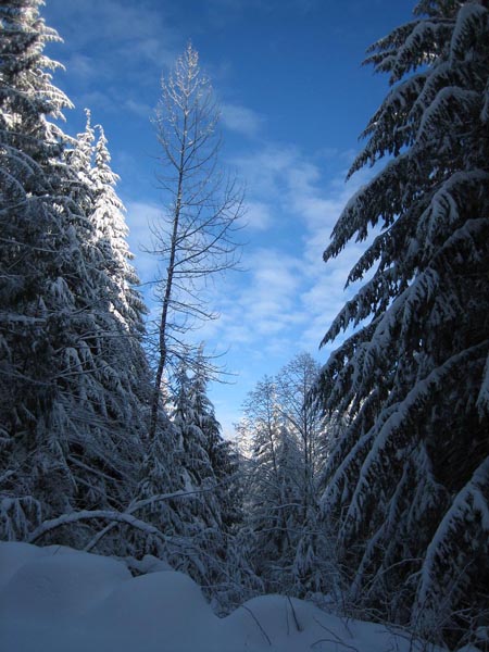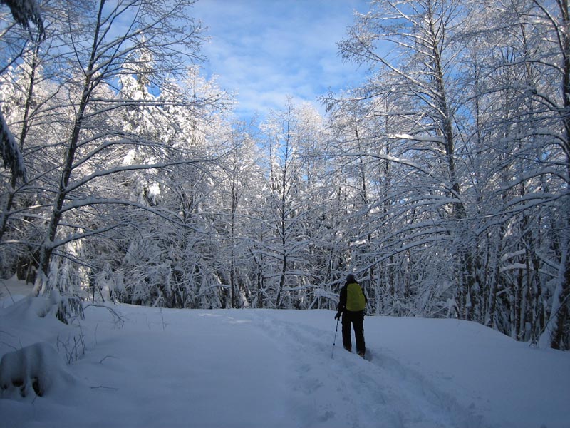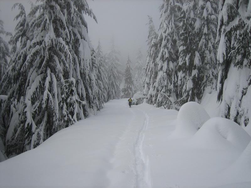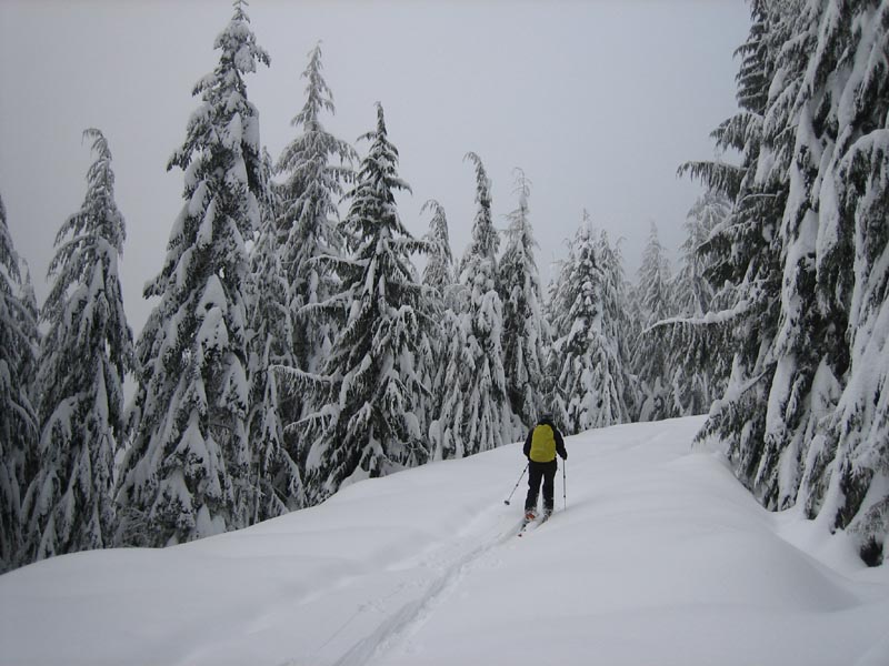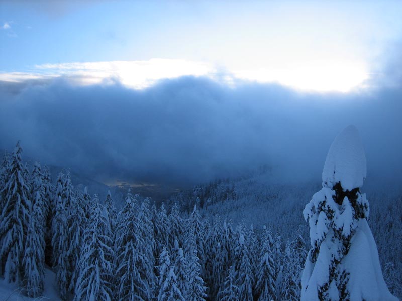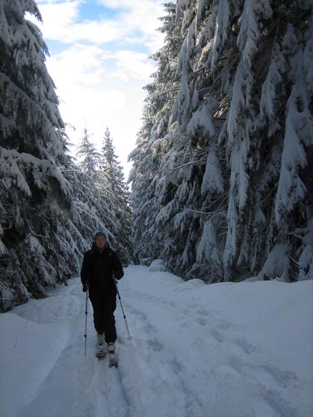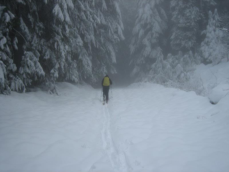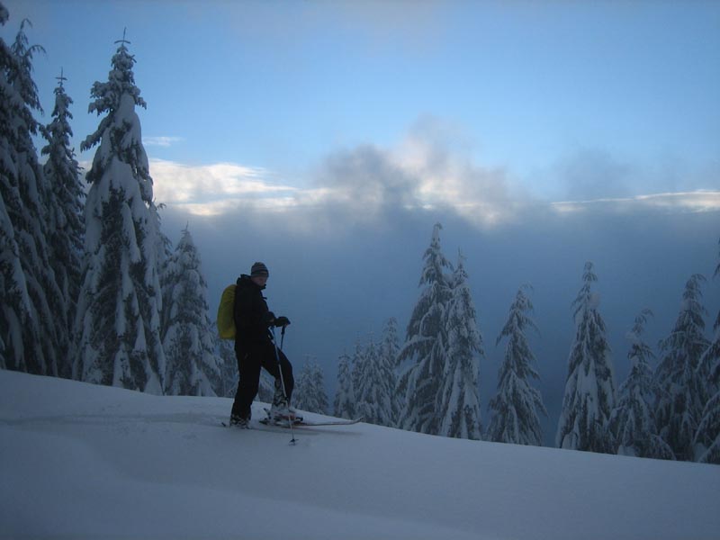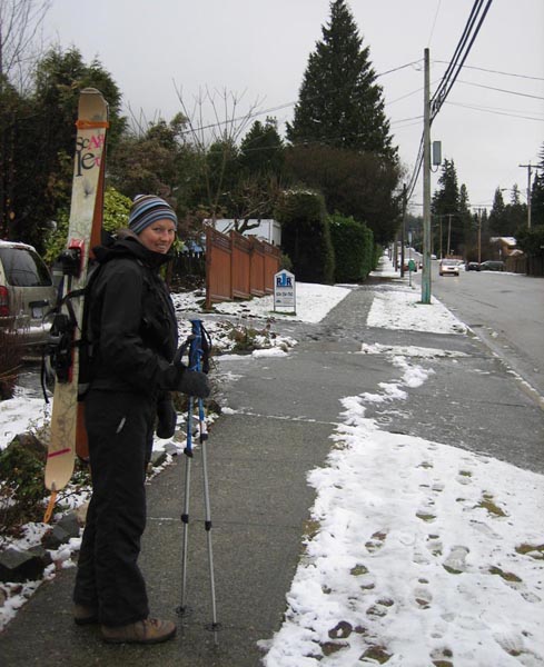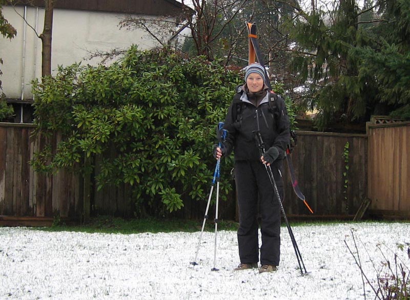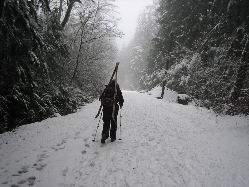 Ski touring in the back yard. This time this phrase is 100% correct. We started from our apartment to go up to Grouse Mountain. It took us about 4 hours. We had about 3 cm of snow in the back yard, quite not enough to do ski touring. After about 15 min. of hiking we could put the skis on.