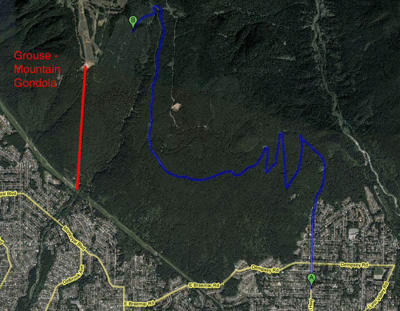 We started at location "A". Location "B" is the top of Grouse Mountain. It is about 10 km from A to B. To get down we used the Grouse Mountain Gondola. From there we took the bus home. At the end quite close to a zero carbon footprint.