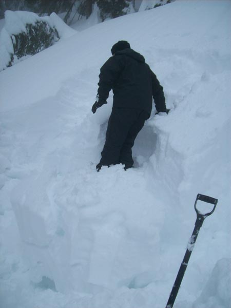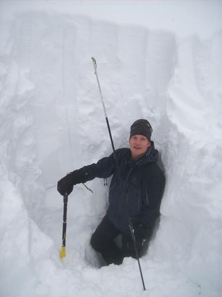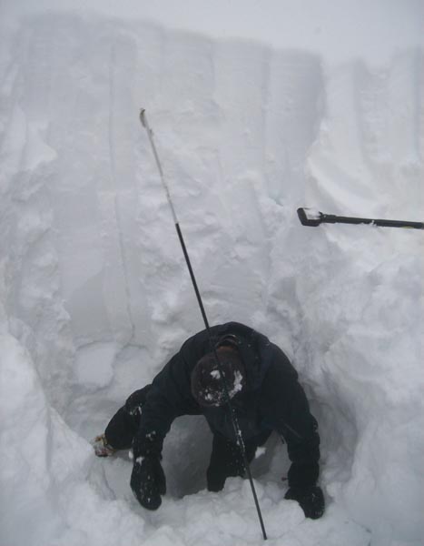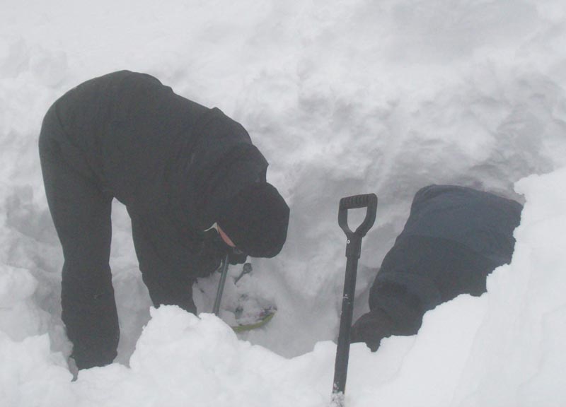 We used the probe to find out about the total snow depth. The probe is about 260 cm long and we couldn't feel any ground. After digging for a while we still couldn't feel any hard resistance so we had to dig more.