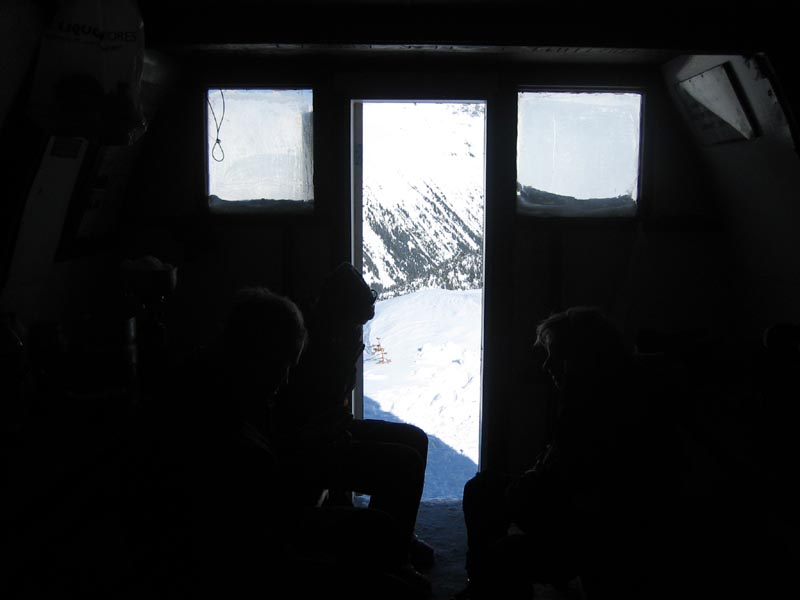 Back at the hut, eating the rest of the food and cleaning up.
