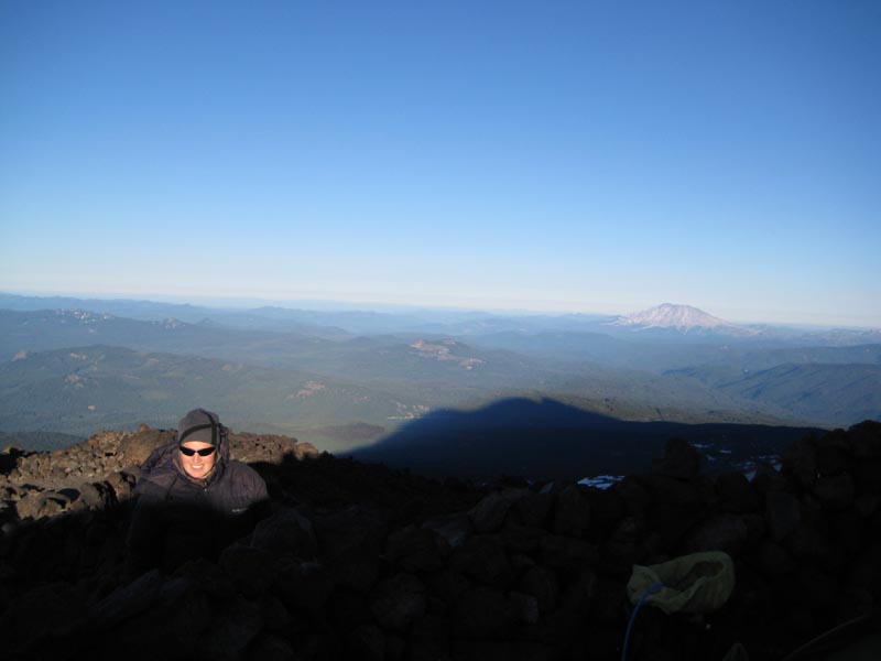 We woke up to blue bird skies. Kerstin enjoying the sun rise. You can see the shadow of Mt. Adams, Mt. St. Helens is in the back.