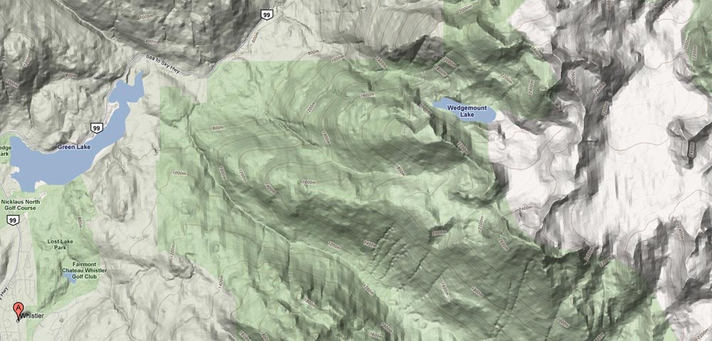 A map of the area, Whistler on the south - west. Wedgemount Lake is about 10 km away from Whistler.