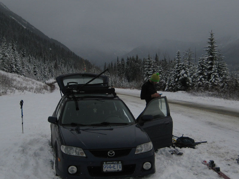 He heard about a hut close to Duffy Lake. So we found the trail head and started to get ready.