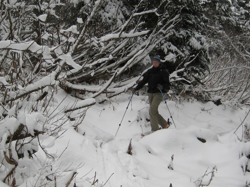 After some time the logging road became a trail and luckily we had two GPSs and old ski tracks to follow. Well, nothing can go wrong from now on!