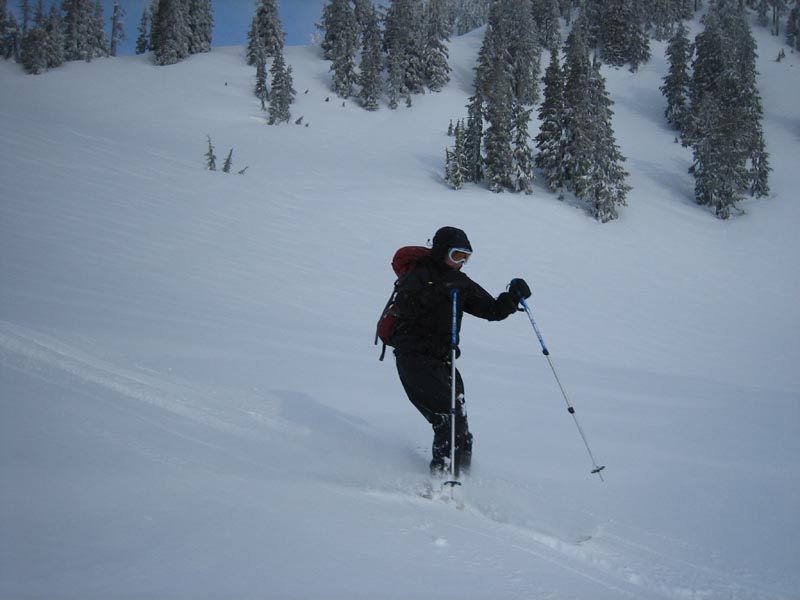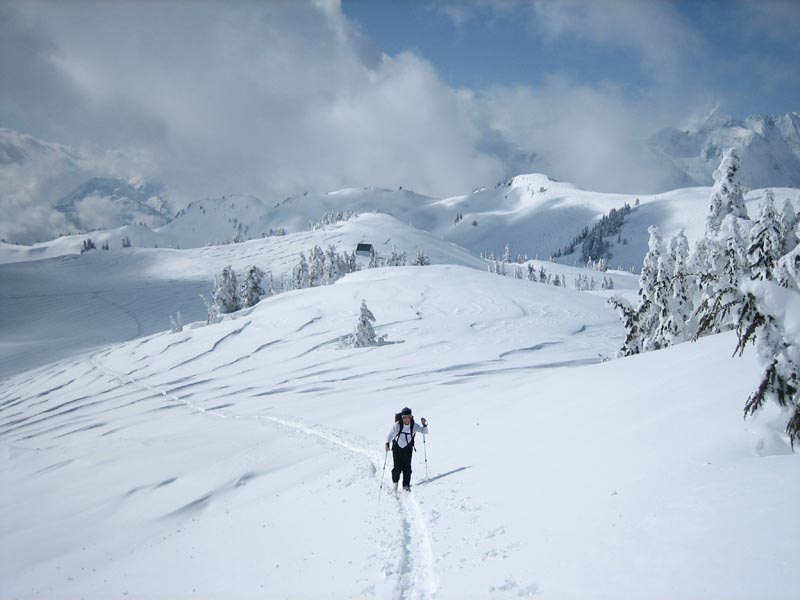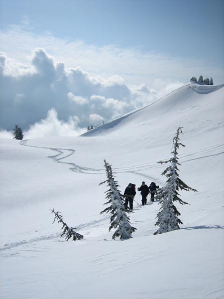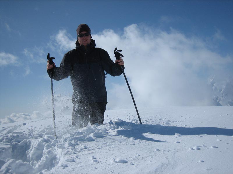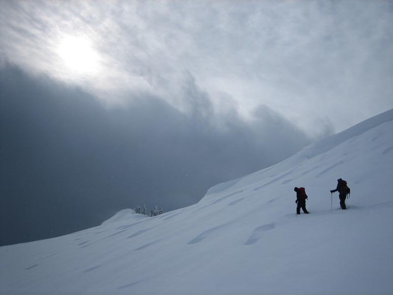 We packed up and left the hut. We thought we could ski down in 2-3 hours. Since it took us 6 hours to get up we thought that would be reasonable. We never thought about the storm which deposited about 50 cm of snow so we had to break trail again on the way down.