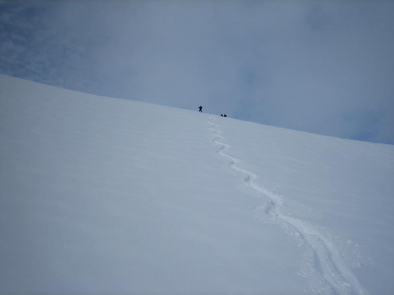 It was a horrible storm last night so when we left the hut we had to break trail everywhere no matter how steep we went downhill. We also didn't want to ski too steep slopes due to avi danger. Kerstin and Gili. Gili arrived on Saturday with a friend.