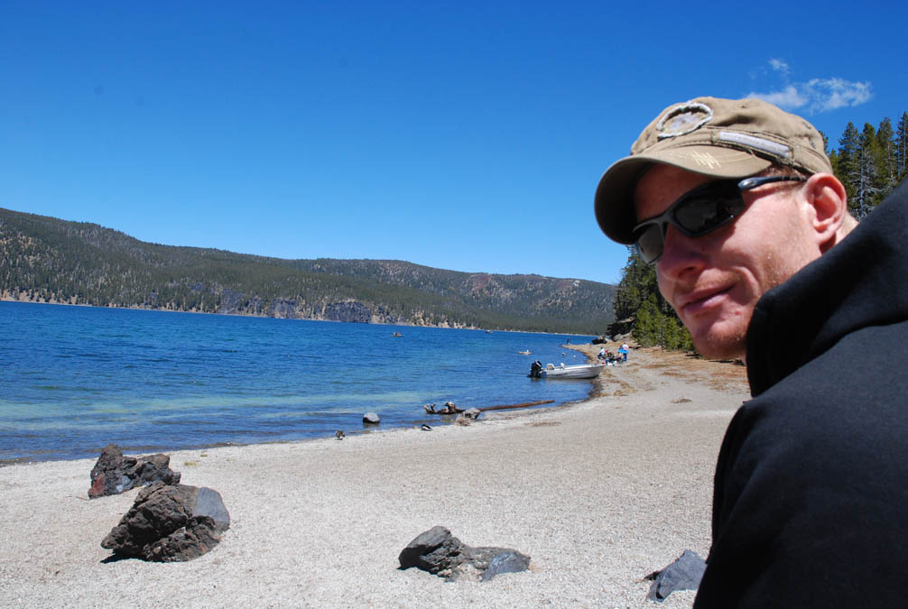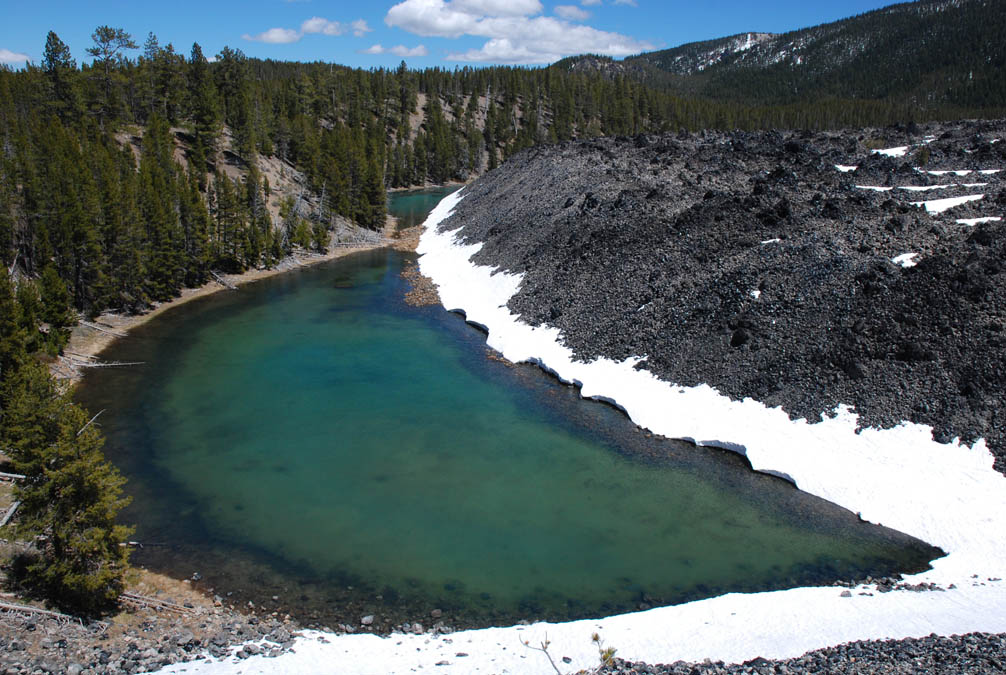 Newberry Lake is similar to Crater Lake, there is a big crater rim around it and the crater filled up with water. The difference to Crater Lake is that there are fish in and it has water flowing out.