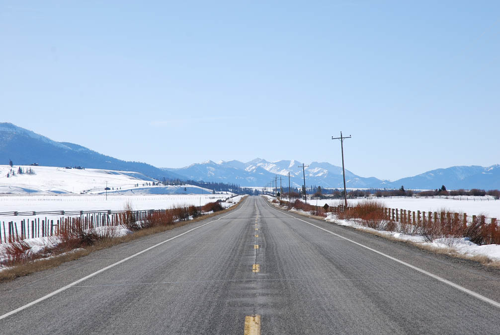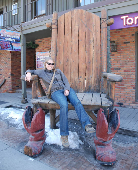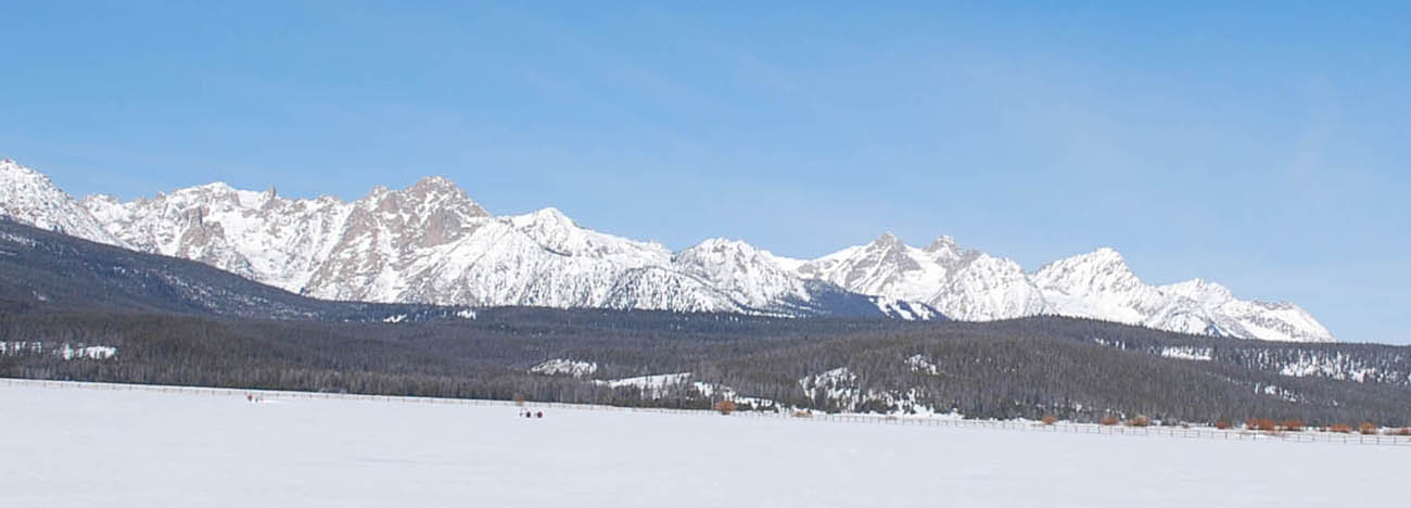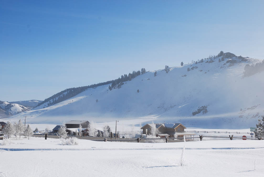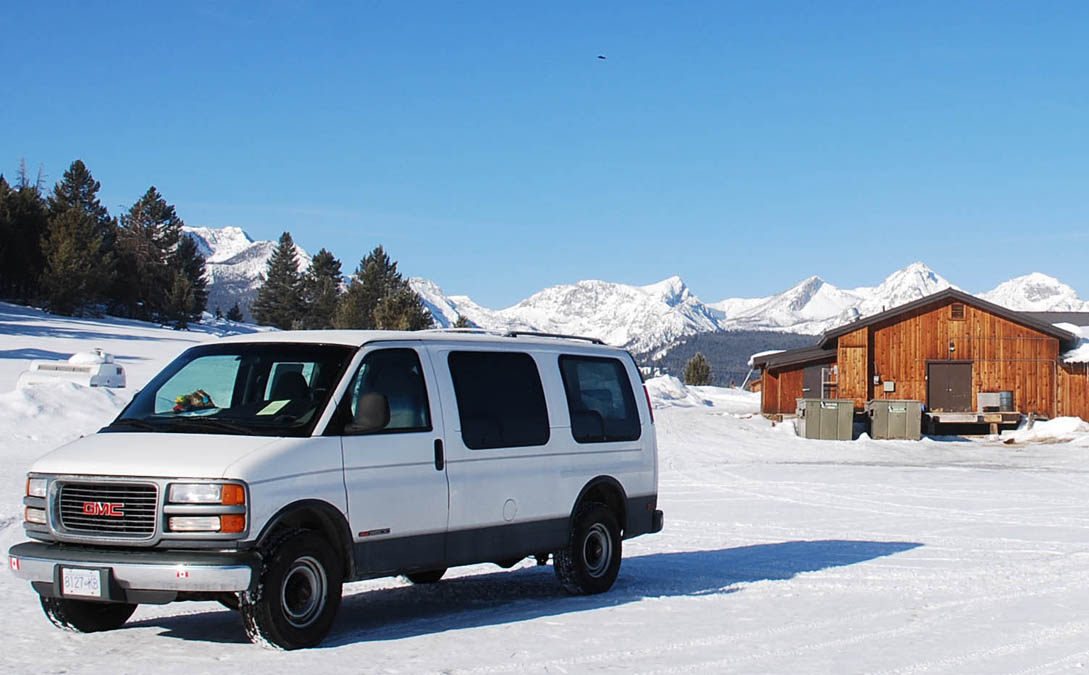 Our Van on the public parking lot in Stanley, Sawtooth Mountains in the back.