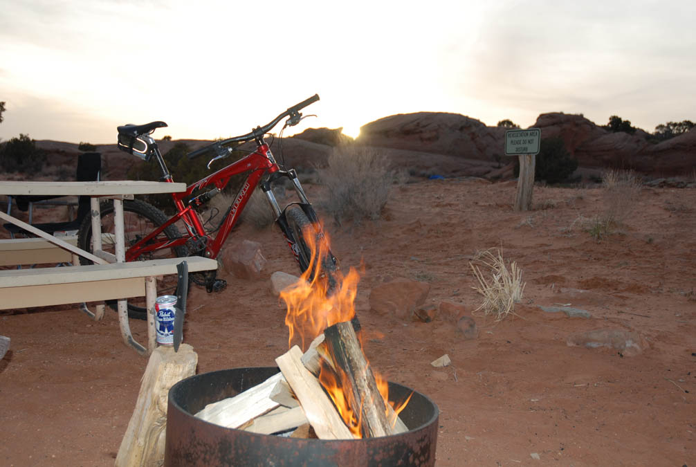 Later on at the camp ground. Bike, PBR, knife (Vic, I used it to split wood actually) and a fire. What else do you want.