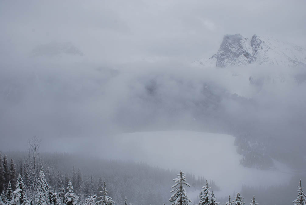 Visibility wasn't good when we started but after a while we could see where we came from, Emerald Lake at the bottom.