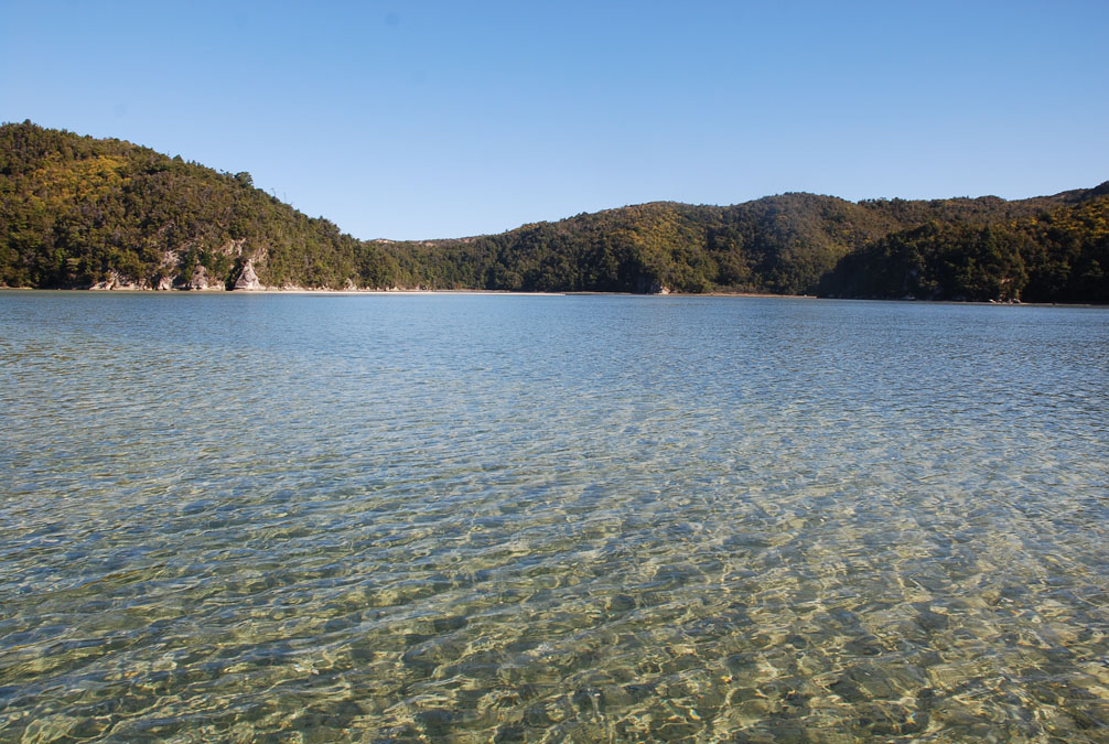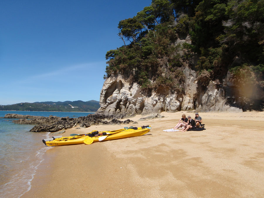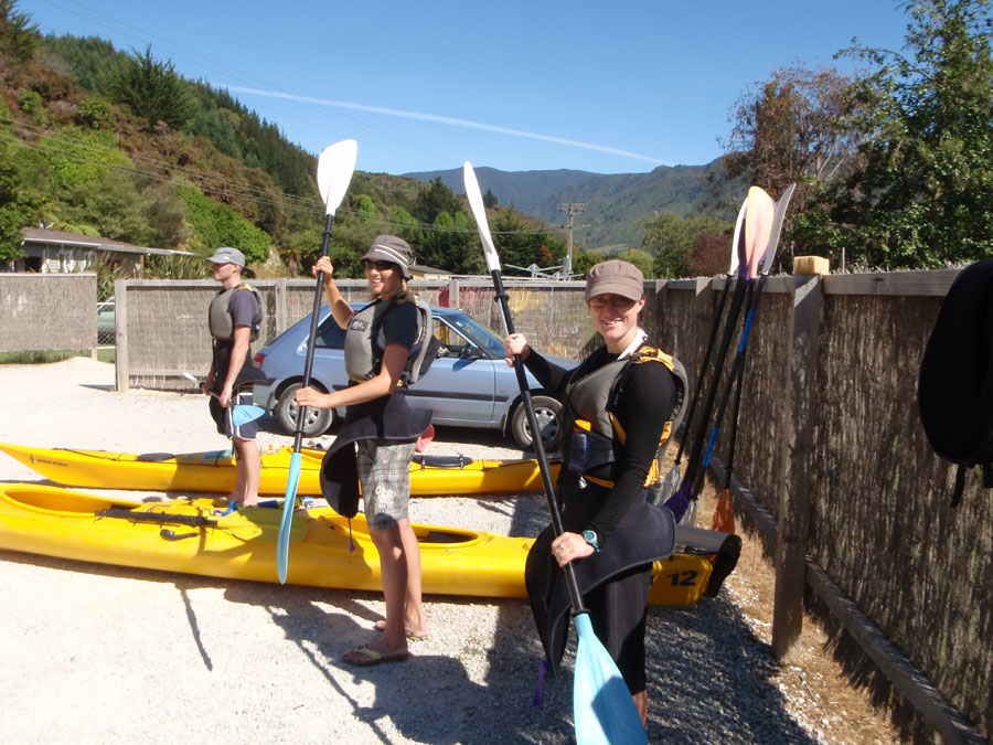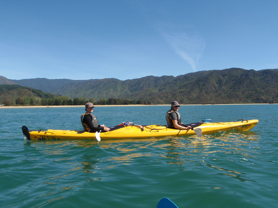 From Farewell Spit on the top of the South Island we drove a little bit south to go sea kayaking for two days. We loaded up the boats with our tents and food and got ready for departure. First we had to do a safety orientation, Kerstin and Naomi practicing on land how to kayak.