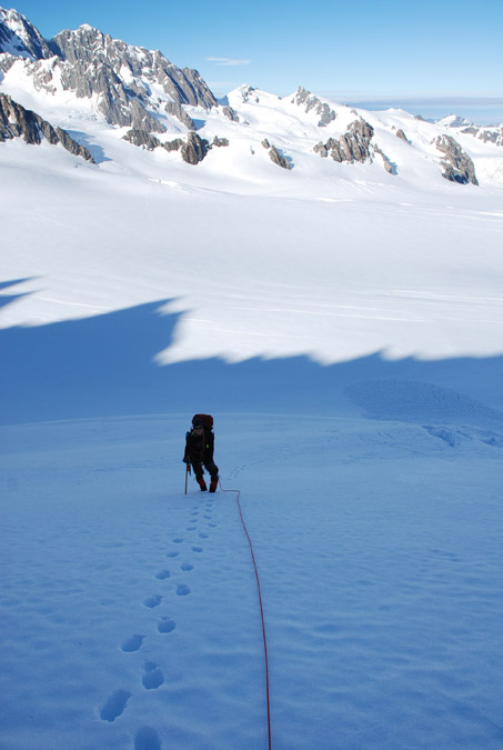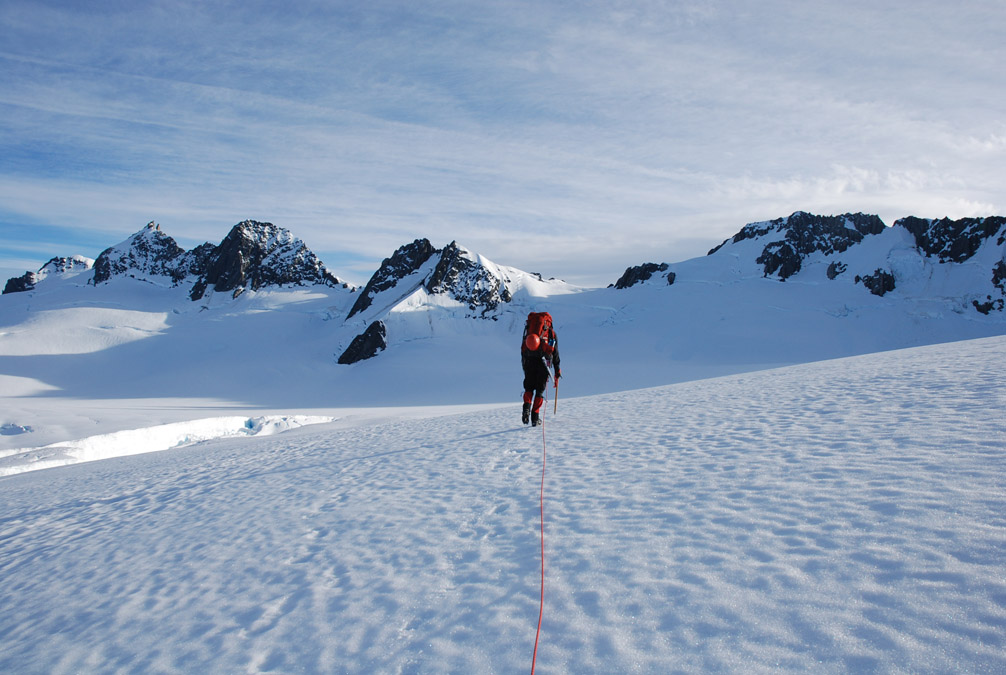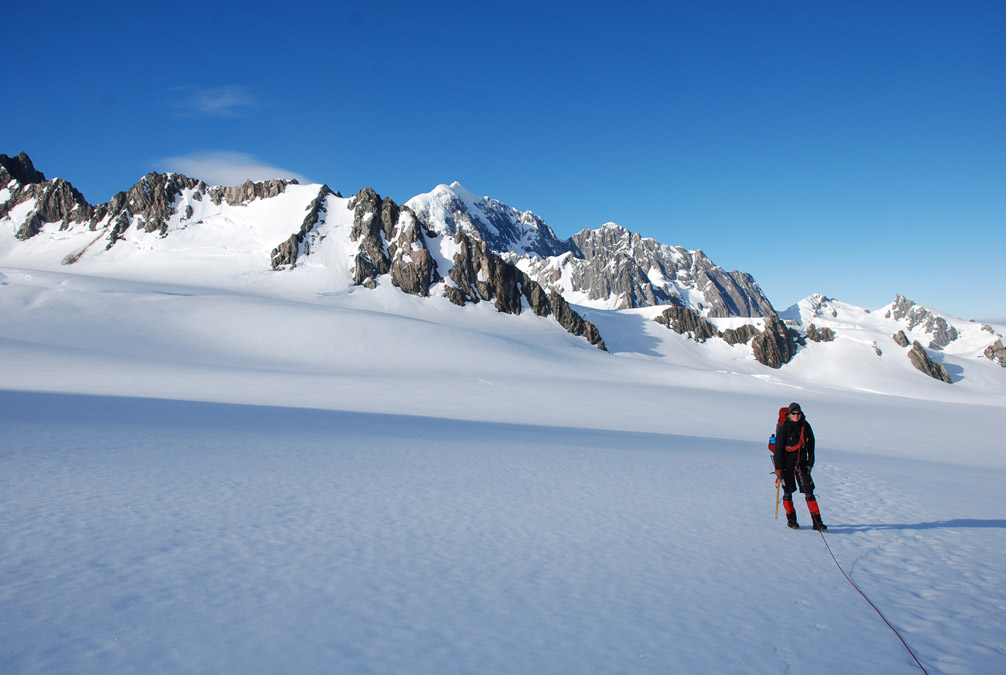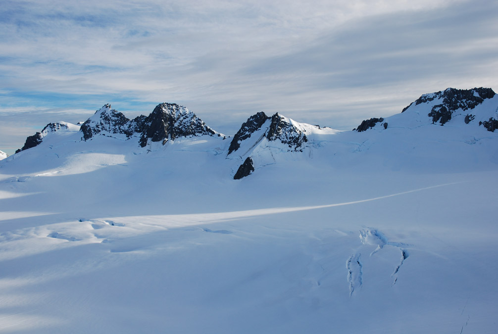 View back with Mount Tasman, the second highest peak in NZ with 3400 m, and Pioneer Ridge where the hut sits on.