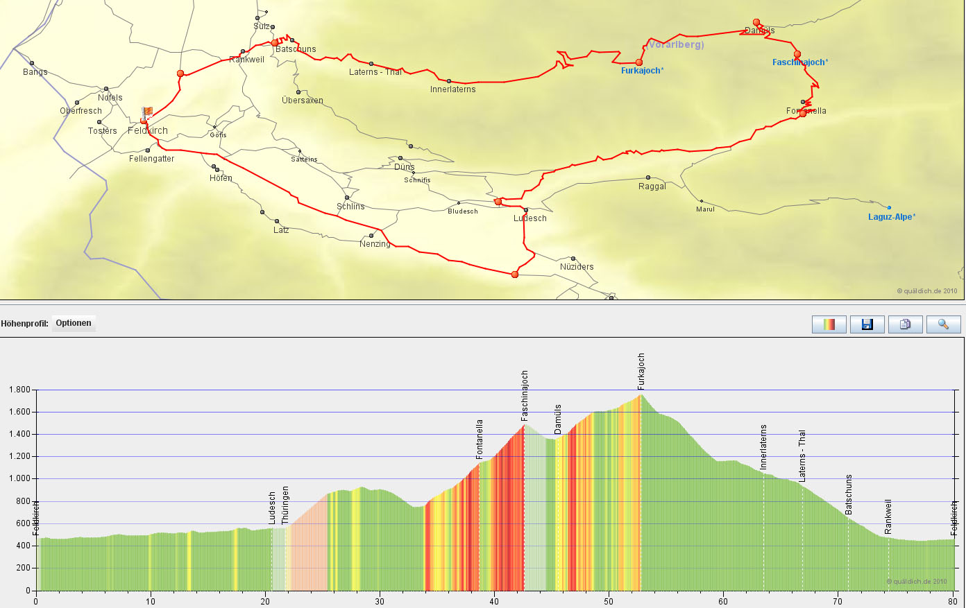 In the morning I rode my bike from Feldkirch where we live to my company close to Nenzing. After work (around noon :-)) I jumped on my bike and continued my ride via Ludesch, Faschinajoch, Damüls, Furkjaoch back to Feldkirch. Pretty wicked ride for an Friday afternoon.