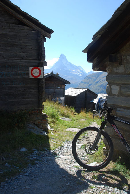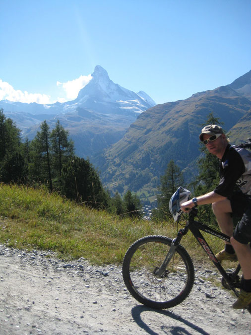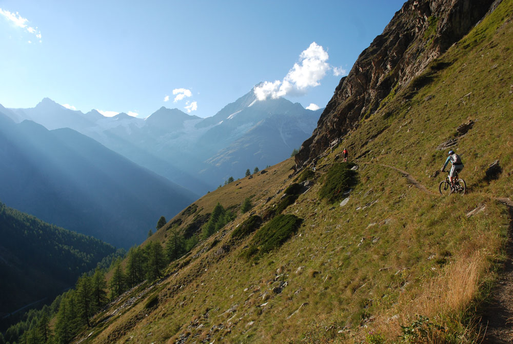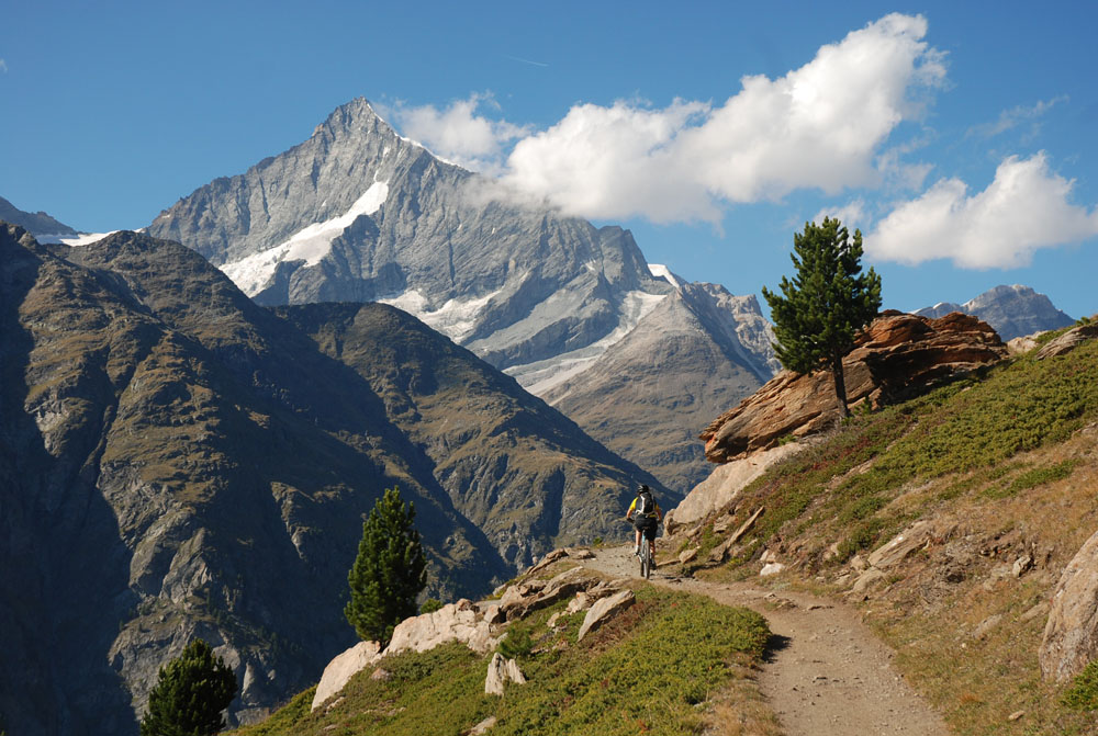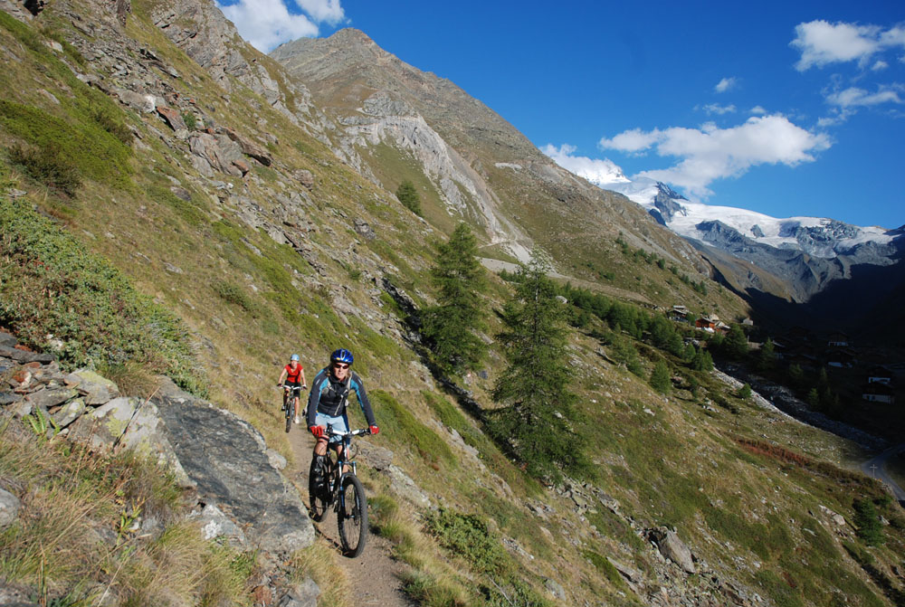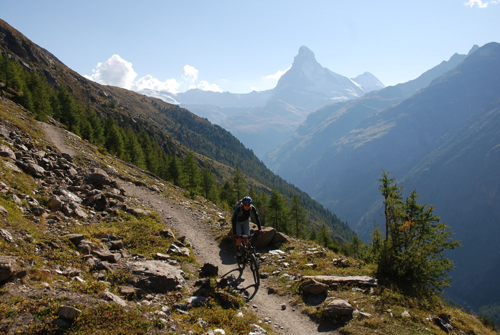 Peter riding along the trail, Täsch in the back.