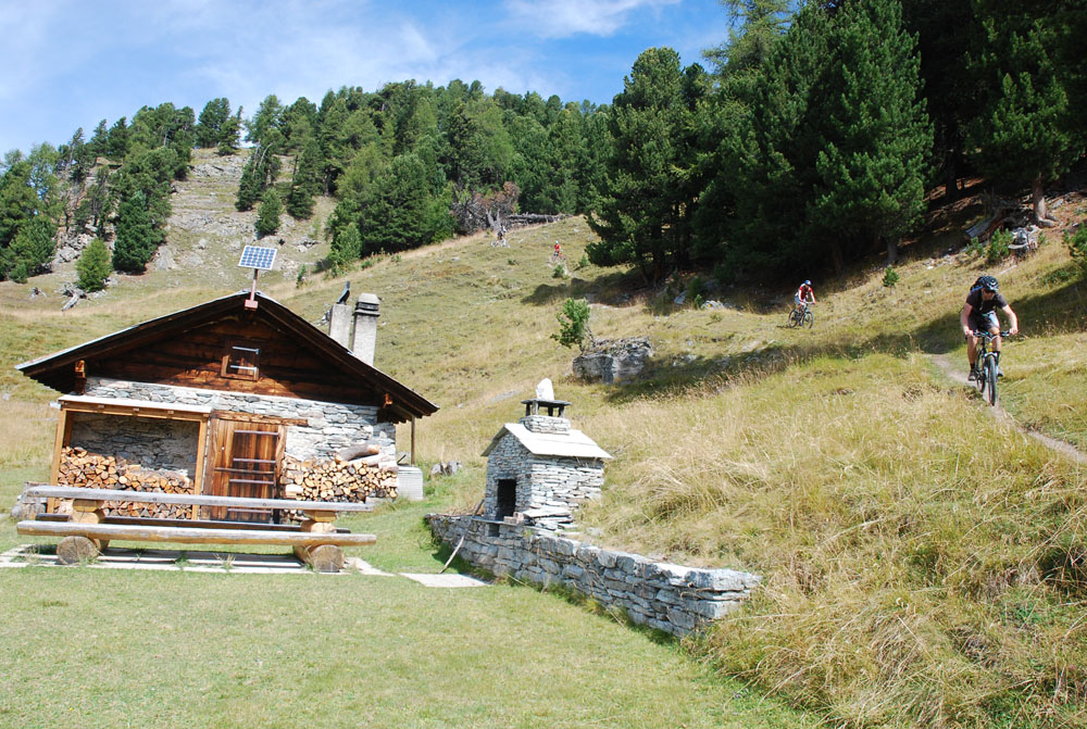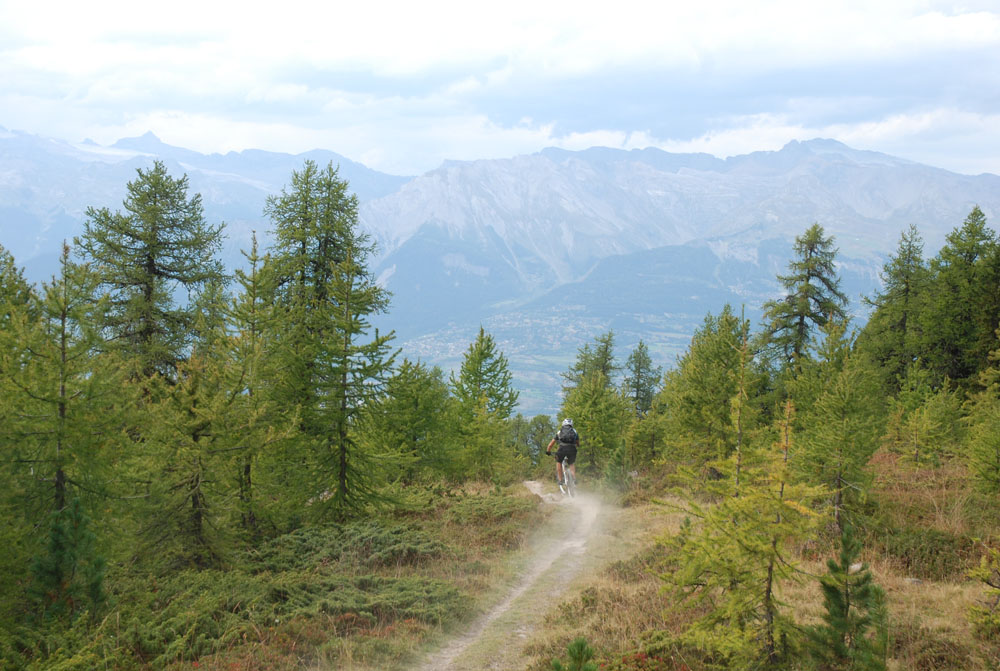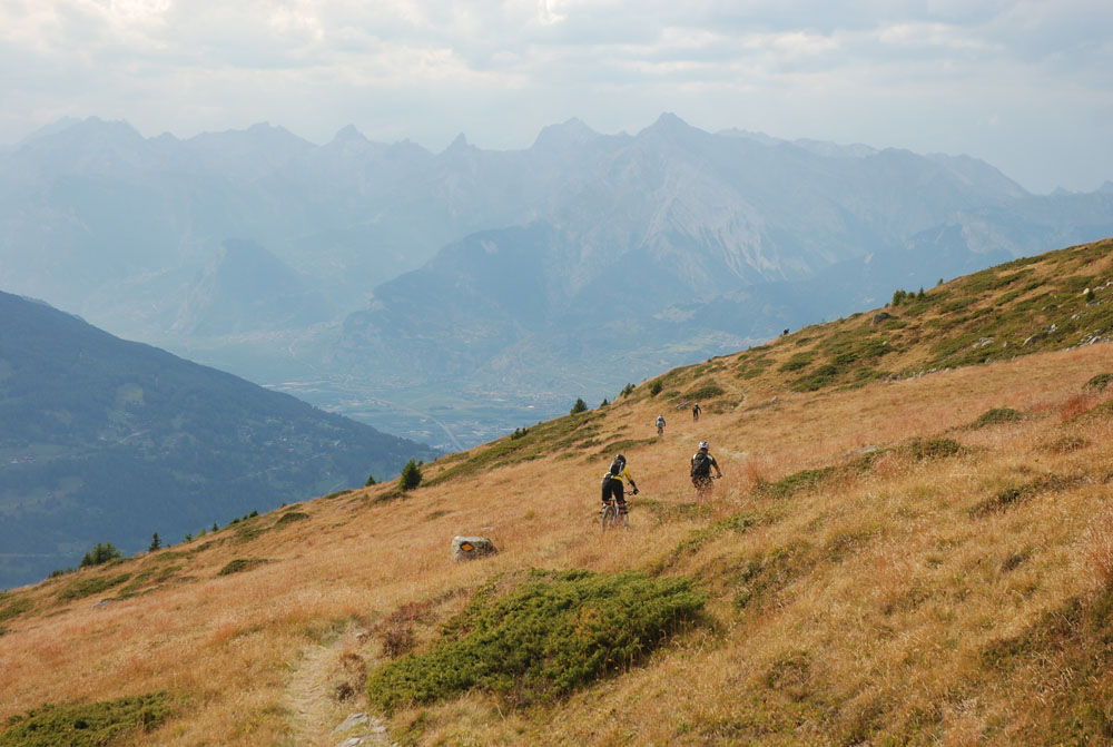 We left Zermatt towards the Rhone Valley. Close to Sion we caught two cable cars (after 3 days of riding we got tired). At roughly 2400 meters we started our descent, 2000 m into the valley. The trail is called Brazilian, I think Wade Simons gave this trail this name after a visit to the area.