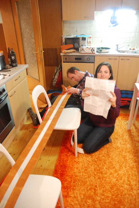 Mrs. Theresia, a well know visitor to us (sometimes she visits us more than our parents), came down to our new home. Stefan came along to do some skitouring and to check out the area. They both arrived friday night after a long drive due to traffic jams.Mrs. Reichenbach tells us what to do! We had to cut skins for Stefan's Brettl.