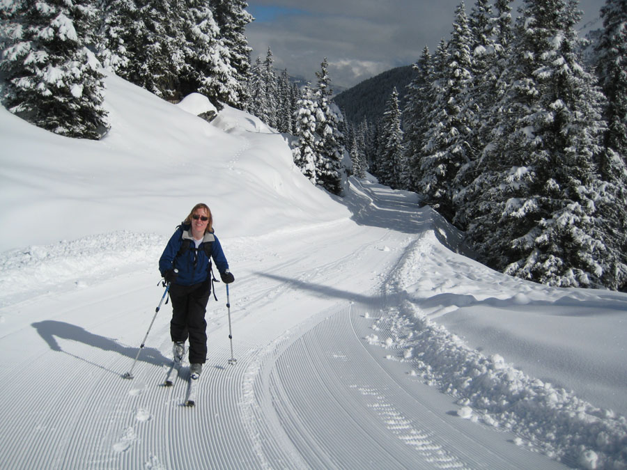 Since the main road was groomed we decided to ski down the track. Judith skiing down.
