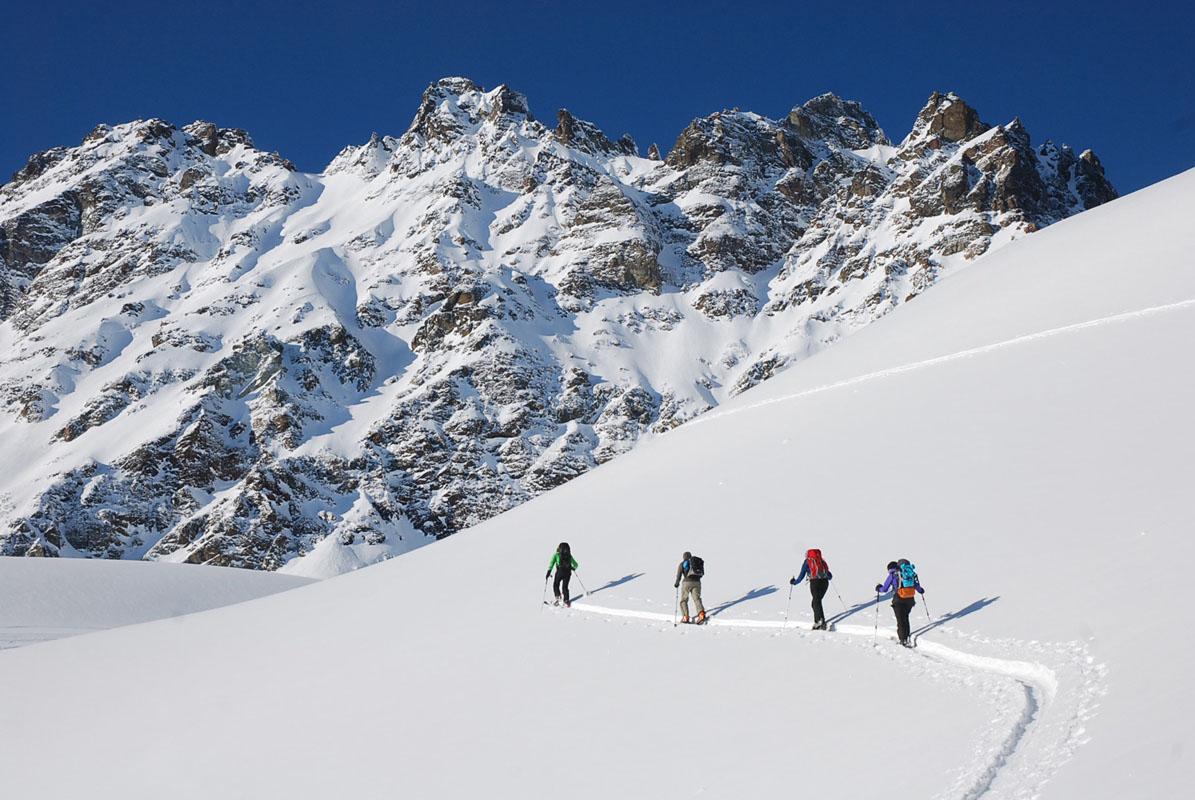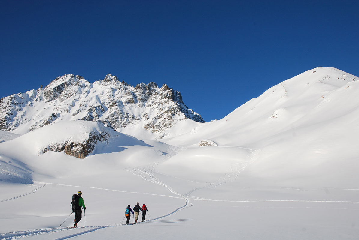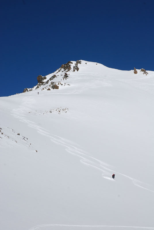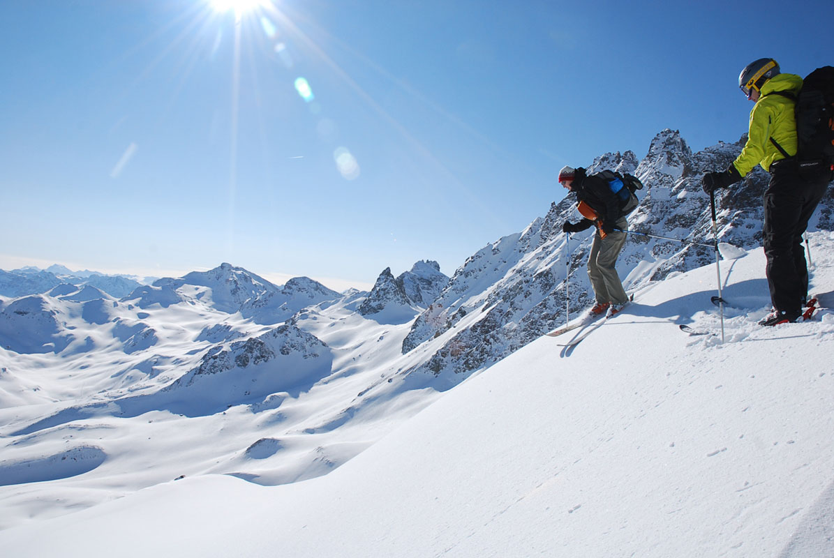 Judith and Kerstin skiing down from Piz Larain.
