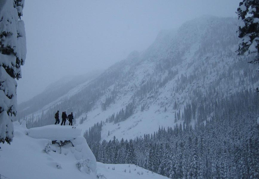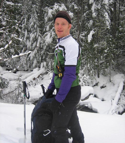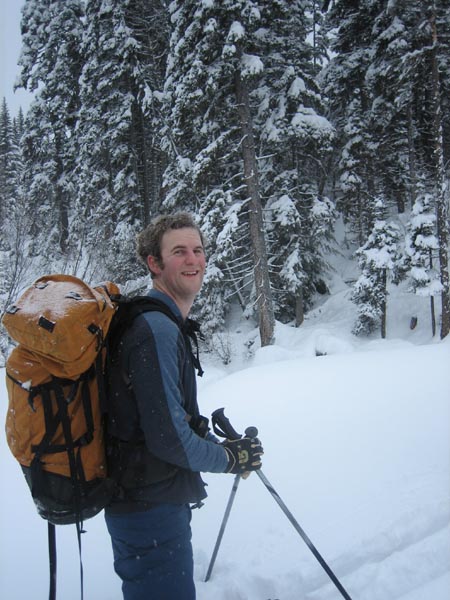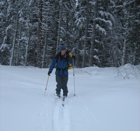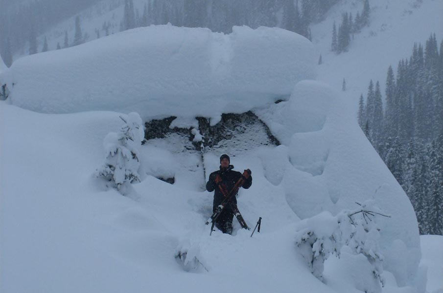 After three and a half hours we reached the end of the loggin road (half of the hike). Seppel hiked up to the hut in late Summer and it took him about 2 hours to get there. We were all quite tired and exhausted. It was already 1:30 pm and so we decided to turn around. Before we did so Seppel did a jump down a rock. It didn't hurt at all because of the deeeeeeeep powder.